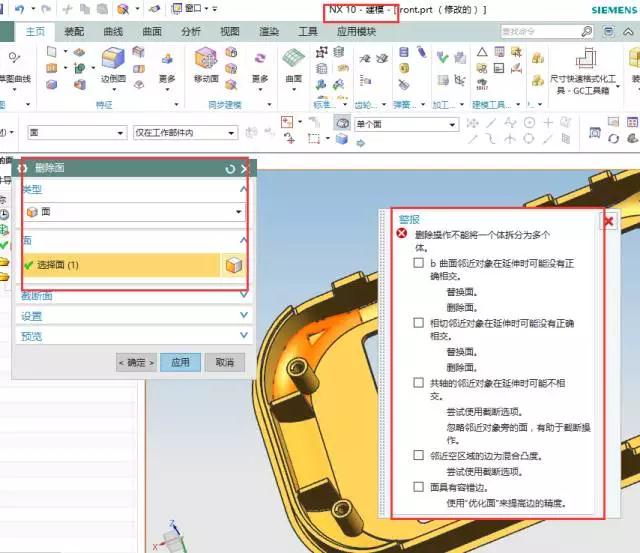 很多朋友都在修模的時(shí)候遇到過這樣的問題,就是當(dāng)你使用同步建模的時(shí)候,用刪除面的時(shí)候,選擇一個(gè)面刪除,會出現(xiàn)報(bào)警。這個(gè)是因?yàn)槟氵x擇要?jiǎng)h除的面與其他面之間存在一定的關(guān)聯(lián),你刪除這個(gè)面后無法計(jì)算,所有就會出現(xiàn)報(bào)警的情況。