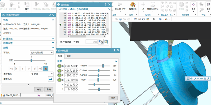 下圖可見界面非常清楚的表示出你想要的所有信息,包含各個(gè)軸的運(yùn)行狀態(tài),當(dāng)前運(yùn)行的G代碼和行數(shù),并可實(shí)時(shí)顯示3D除料狀態(tài),了解切削狀態(tài)。同時(shí)還可以顯示切削時(shí)間,使用刀具,主軸轉(zhuǎn)速,切削進(jìn)給速度等信息,并在仿真結(jié)束后查看殘留厚度等?。。?!